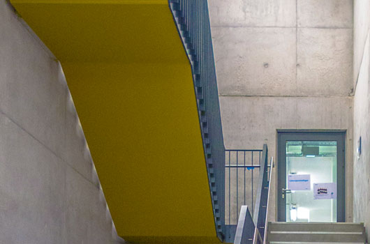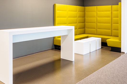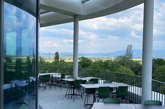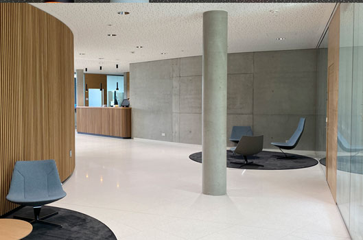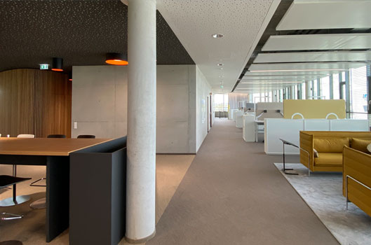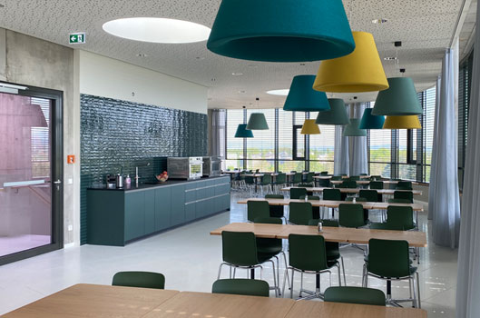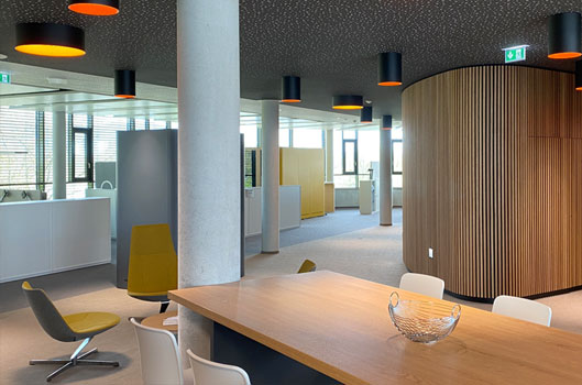 Büroflächen für ca. 180 Mitarbeiter/-innen, Konferenzbereiche und Betriebsrestaurant.